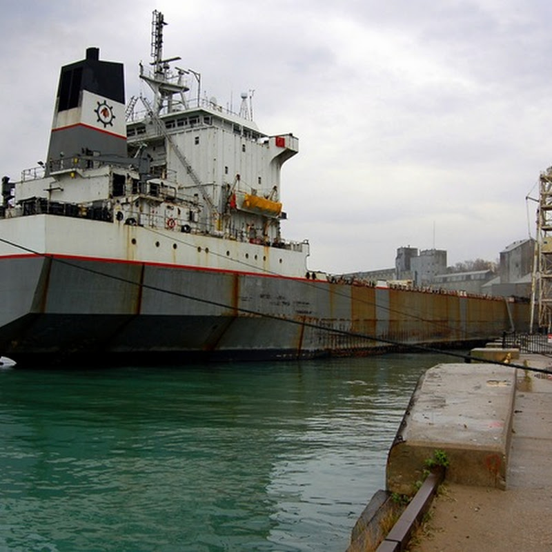 A SMALL LAKE FREIGHTER IN THE GODERICH HARBOR TAKES ON EITHER A LOAD OF BEANS OR CORN I THINK THESE FELLOWS BETTE...